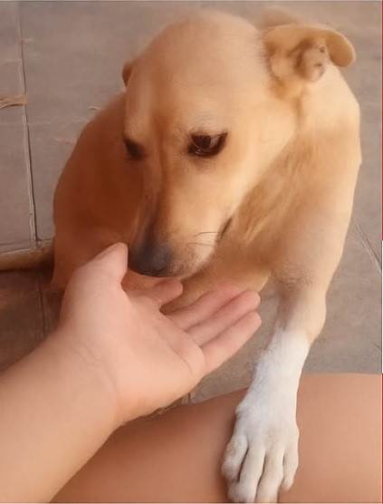 Mel é uma cachorrinha dócil, mas está assustada, pois nunca ficou na rua. Se você a vir, aproxime-se com calma, ela aceita carinho.