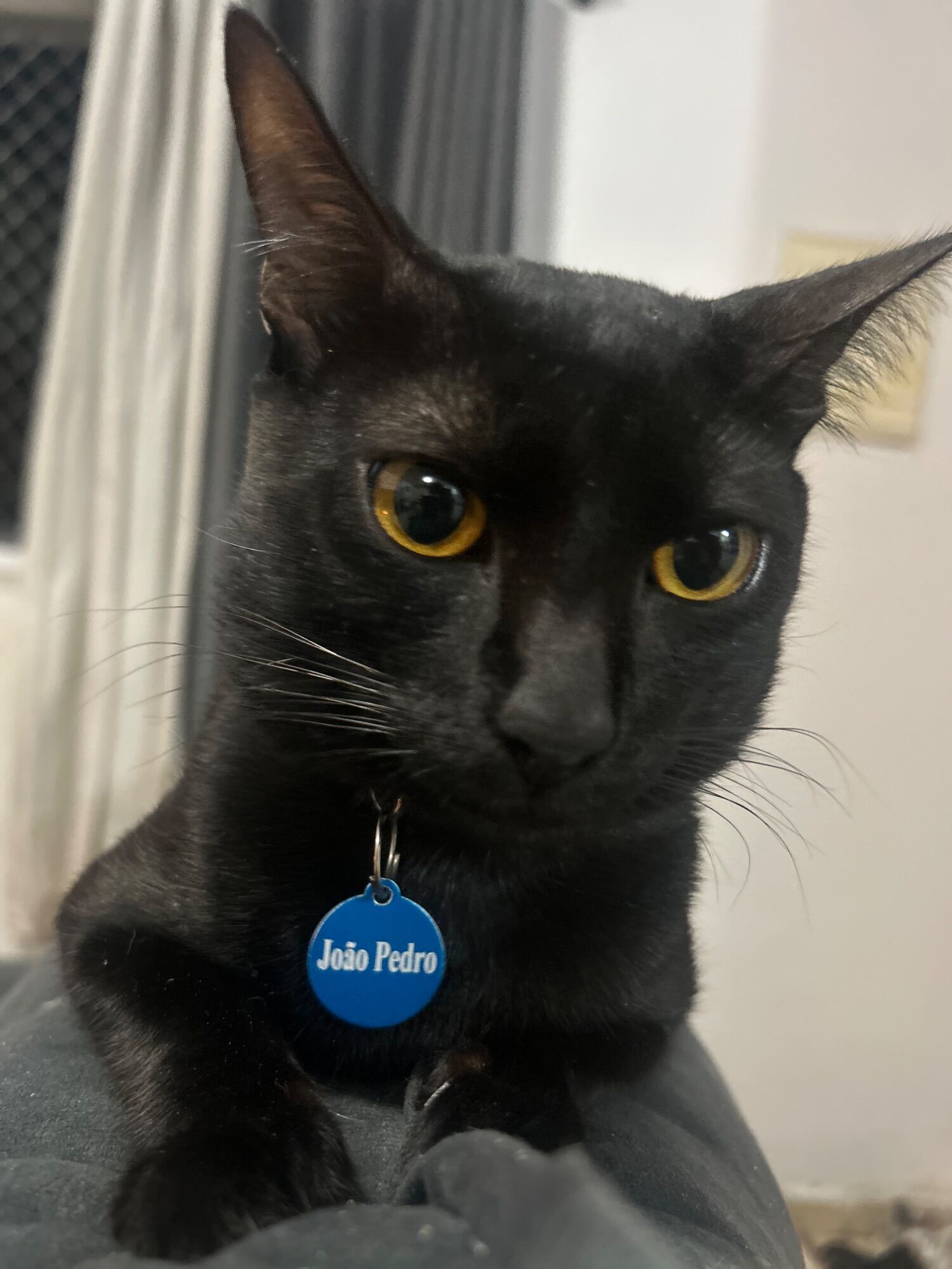 João Pedro tem 2 anos, é pequeno, castrado e possui uma pelagem preta brilhante. Seu temperamento é dócil e ele é muito sociável, especialmente com outros gatos. Ele estava usando uma coleira azul com uma plaquinha indicando seu nome.